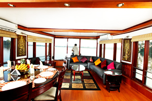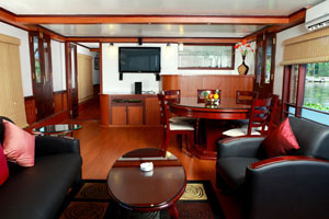compromise. The first houseboat to be fully air-conditioned, it houses two elegantly furnished large comfortable bedrooms with split air-conditioning units which are absolutely noiseless, LCD TV, Surround Music System, Luggage Rack and Cup-board.
